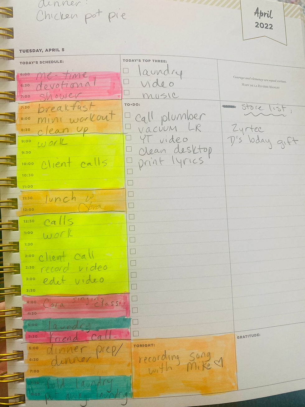 Here is a sample of one of my days. I color code so I can see at a glance if my day is balanced. Again, some days can go off balance and that is ok!